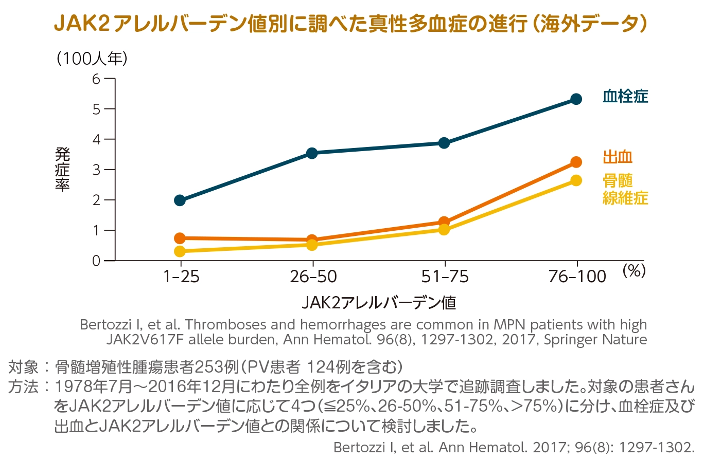 JAK2アレルバーデン値が高いと血栓症、出血などの合併症の発症頻度や骨髄線維症、白血病への移行頻度が高いという研究結果があります。